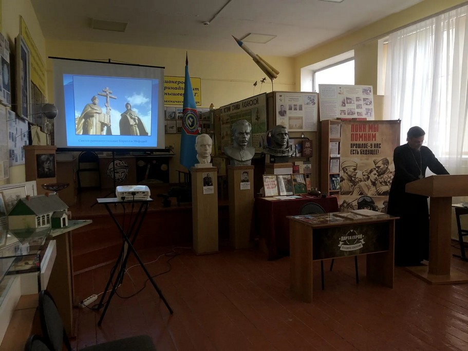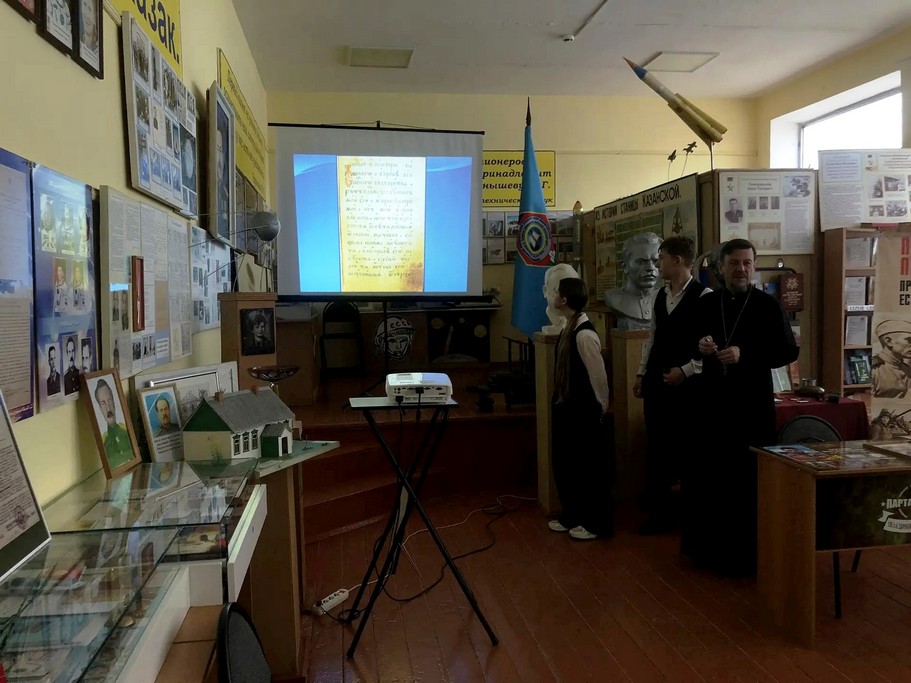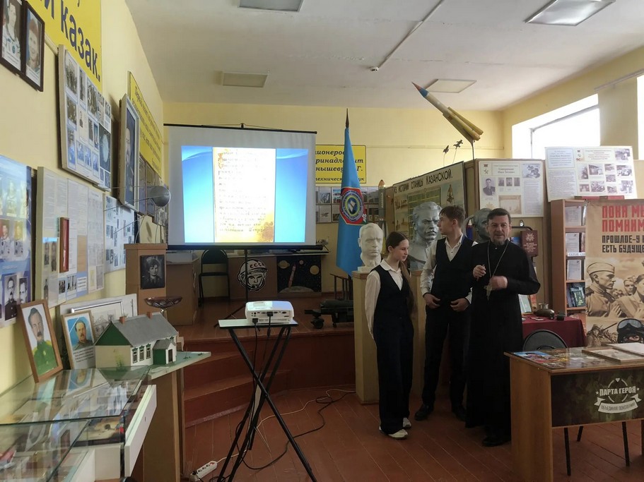 Учащихся 9-х классов настоятель Свято-Троицкого храма станицы Казанской протоиерей Кассиан Кравцов ознакомил с презентацией об истории возникновения книг на Руси.