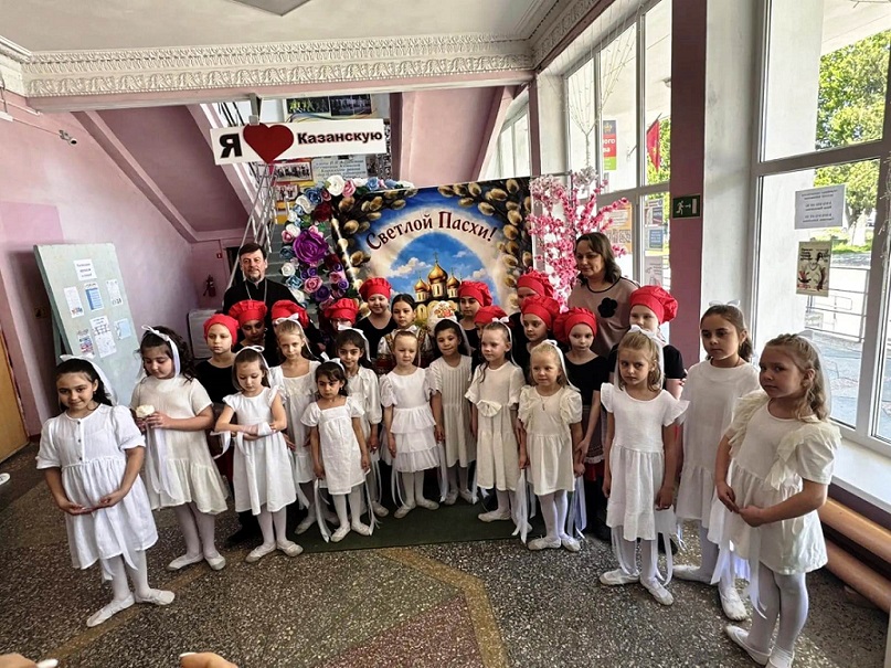 Учащиеся воскресной школы Свято-Троицкого храма станицы Казанской поздравили жителей станицы со светлым праздником Воскресения Христова, а учащиеся 20-ой школы приняли участие в музыкальных и хореографических номерах.